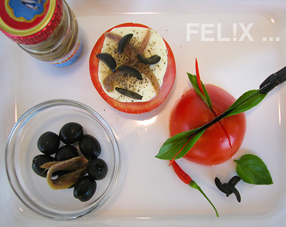 auf eine Platte geschichtet werden die Zutaten normalerweise. Ich mache das etwas anders, nehme ein paar Sardellen, Oliven und – uiiii! – eine Chili mit dazu!