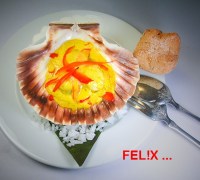 - bei Verwendung von Coquille St-Jacques Schalen: kleine tiefe Teller mit reichlich grobem Meersalz bestreuen, worauf später die Schalen gesetzt werden