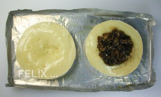 ……Die Camembert-Hälften auf ein Stück Alufolie oder Backpapier setzen. Mit einem Teelöffelrücken eine kleine Vertiefung in die Käseoberfläche drücken und darin den Sofrito verteilen.