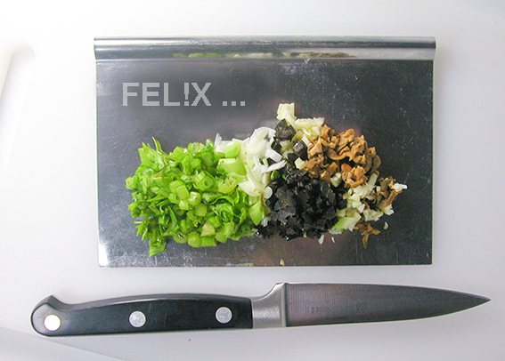 ……Aus der Einweichflüssigkeit heben, ausdrücken und fein hacken.