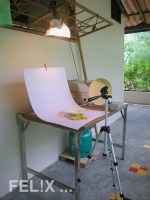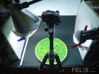Meine zwei Lampen sind ganz einfach eine verstellbare Bürolampe und ein Klemm-Spot, mit neutral-weissem Leuchtmittel. Abgedeckt mit normalem, weissem Backpapier (fixiert mit Wäscheklammern!), das verhilft zu einem milden Schattenwurf – also eine Art Softbox.Seitlich stehen zwei weisse Styroporplatten, um zu verhindern, dass von der Umgebung (bei mir: farbige Wände) irgendeine ungewollte Färbung auf den Teller gelangt.