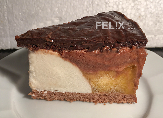 mit einer Mousse aus Gianduja/Nougat, einem Kern aus Kokos-Pannacotta und Mango-Füllung.