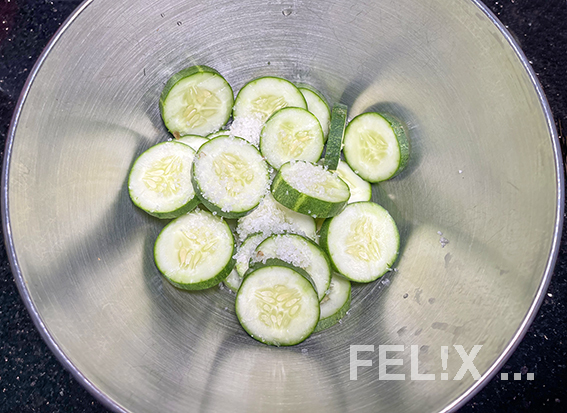 Mit Salz mischen, 30 Minuten ziehen lassen.