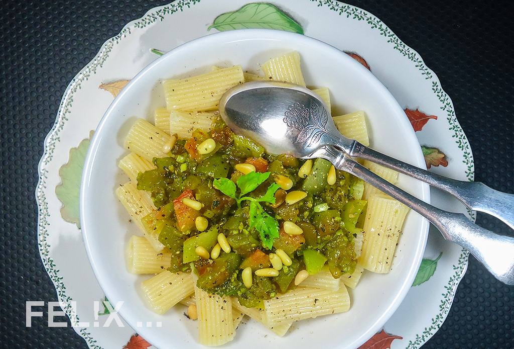 Abgiessen, anrichten und die grüne Tomatensauce darübergeben.