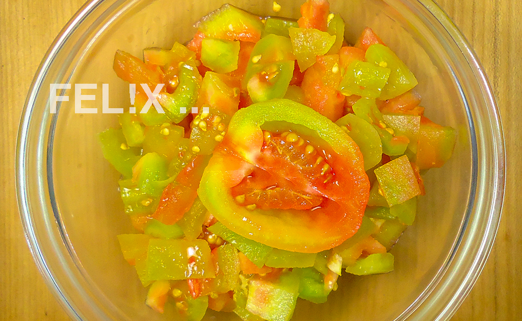 Die Rede ist hier von nicht ganz reifen Tomaten mit ein paar roten Stellen. Gänzlich unreife Tomaten sollten nicht verwendet werden.