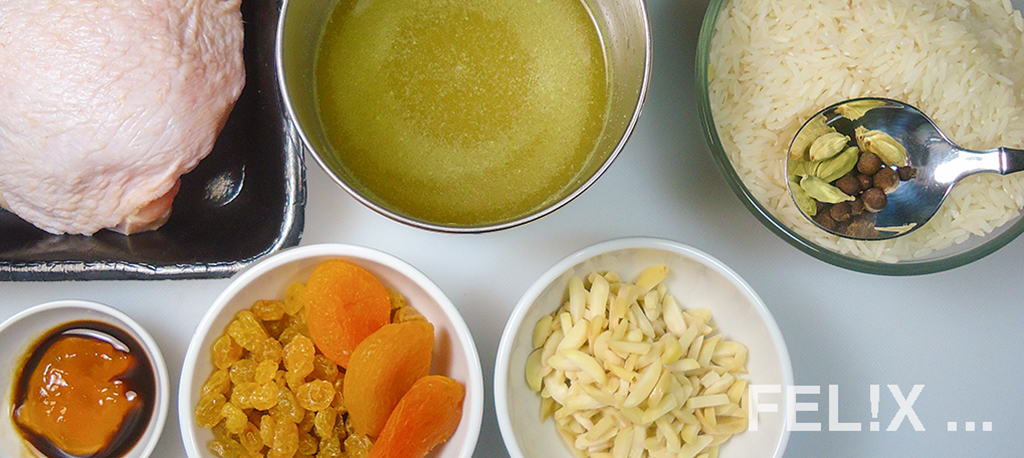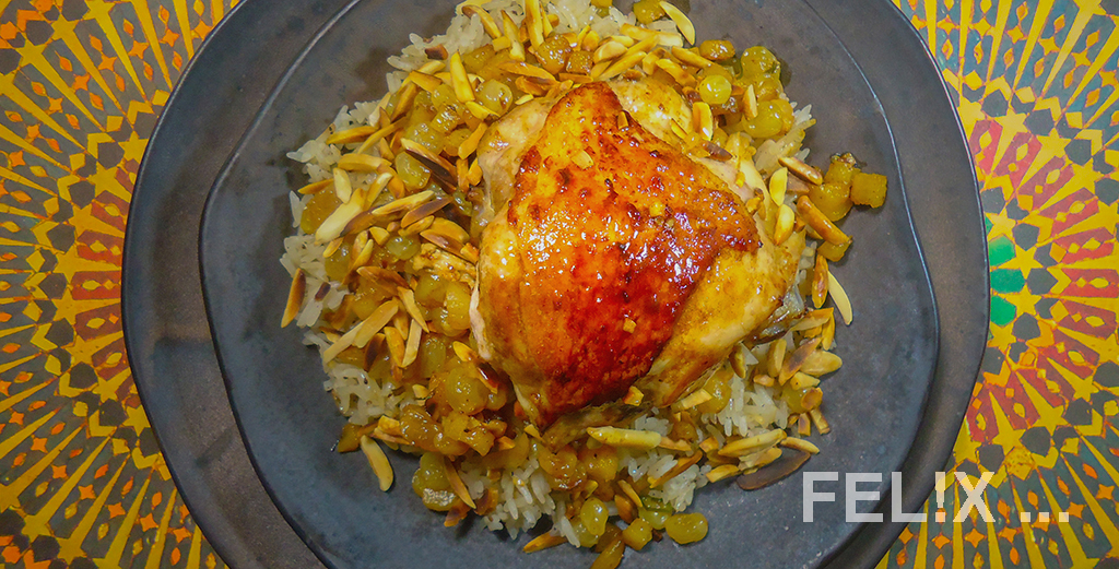 diesem Geflügelgericht mit «Khalta», einer Art Belag aus Mandeln, Sultaninen und Aprikosen, der auf gewürztem Reis angerichtet wird.