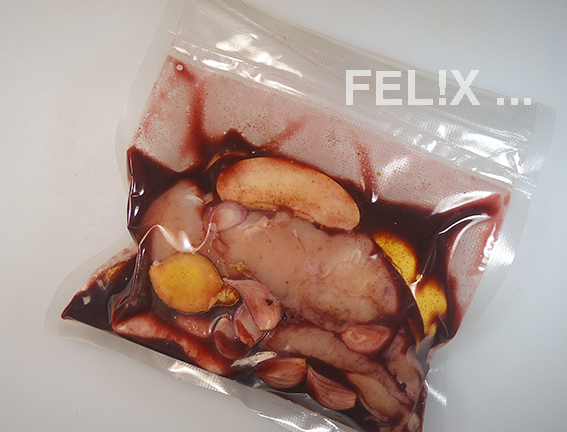 Rotwein-Marinade dazugiessen, Beutel möglichst ohne Luft verschweissen/vakuumieren.