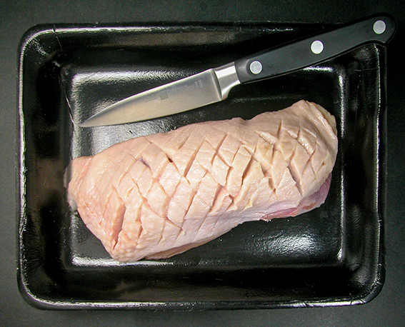 - Mit der Hautseite nach oben auf ein kleines Ofenblech legen (die Fleischseite wird noch nicht gebraten!). Entstandenes Fett abgiessen, im Kühlschrank für etwas anderes aufbewahren.