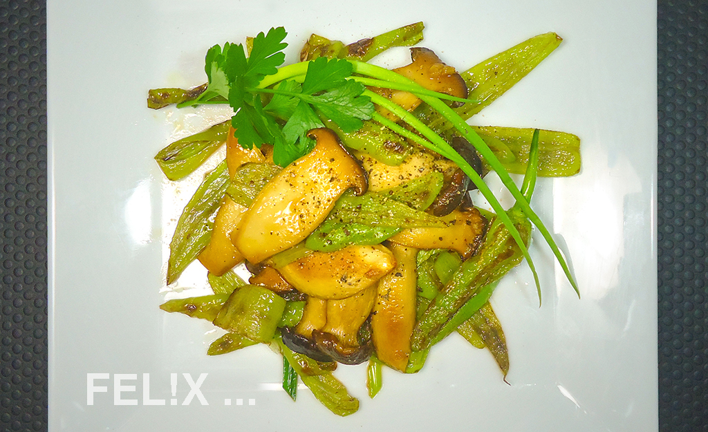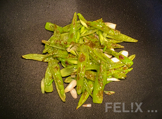 Zum Schluss die weissen Teile der Frühlingszwiebelchen kurz mitbraten.
