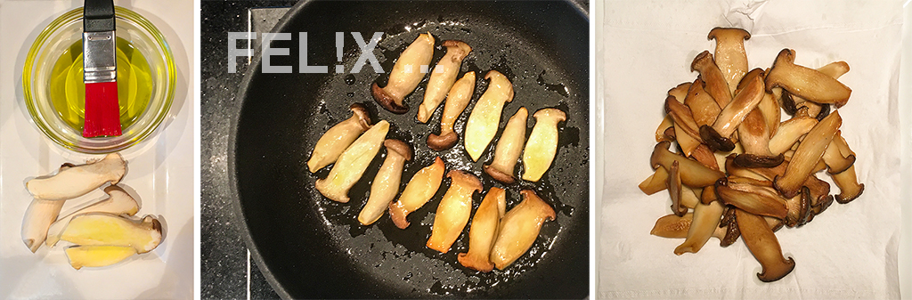 3 Pilze längs in knapp 1/2 cm dicke Scheiben schneiden.