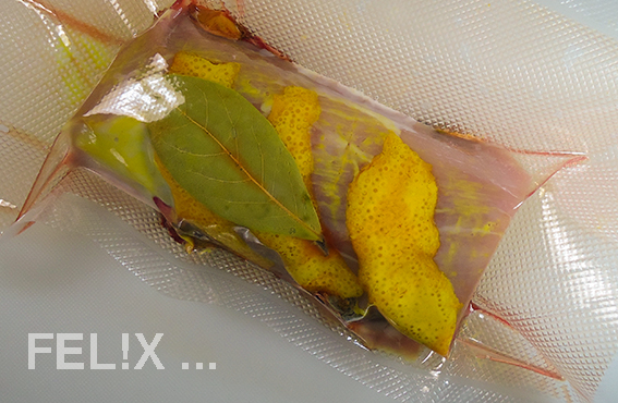Fleisch mit sehr wenig Senf bestreichen, in einen oder zwei Plastikbeutel geben, die abgezogenen Schalenstücke von 1/2 Orange samt Lorbeer und Rosenknospen dazulegen, vakuumieren.