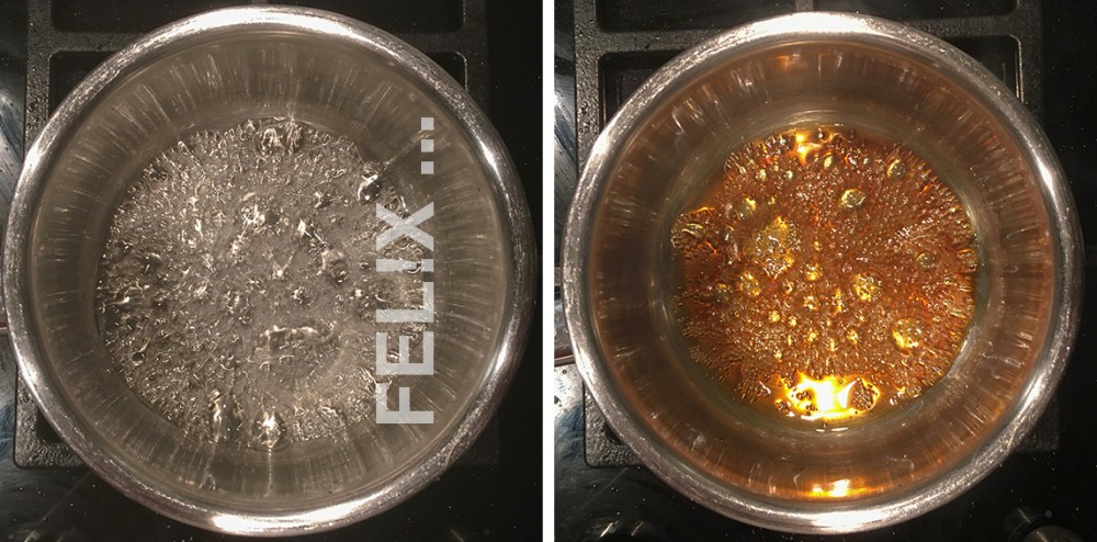 2 Zucker und Wasser in einer weiten Edelstahlpfanne auf mittlerem Feuer hellbraun karamellisieren.
