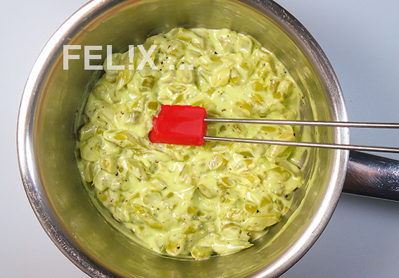 Velouté nochmals erhitzen, Spargelstücke beigeben, nur noch heiss werden lassen.