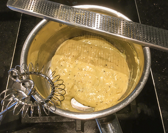 Rahm dazugeben, 1/4 der Zitronenschale dazureiben (Micro-Zestenreibe!), etwas reduzieren, bis die Sauce leicht cremig wird.
