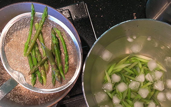 Spargelstücke in dieser Brühe 2–3 Minuten bissfest kochen, herausheben, in Eiswasser abschrecken. Spitzen ebenfalls 1–2 Minuten kochen, herausheben, separat abschrecken.