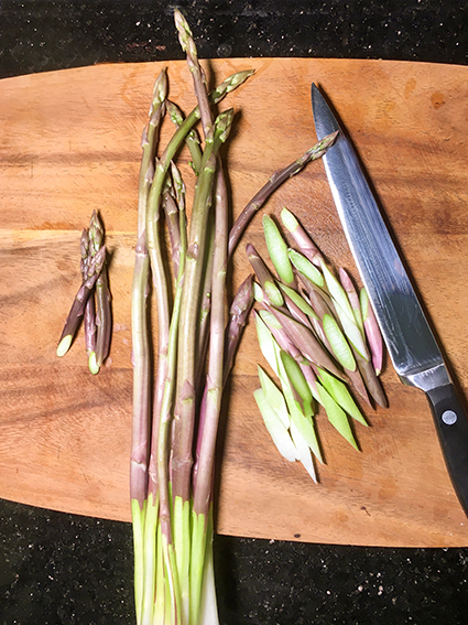 Spargeln im unteren Drittel schälen, Enden wegschneiden.