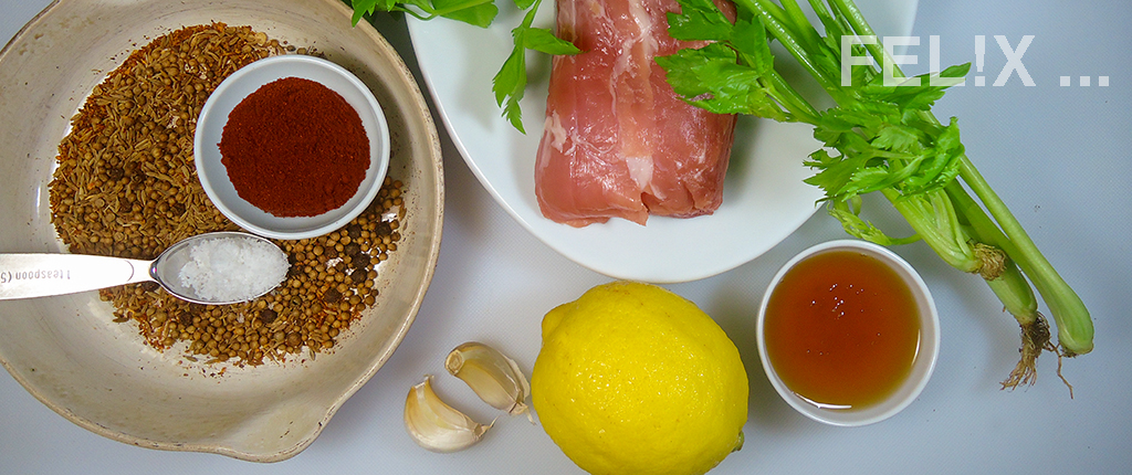 ein Filet vom Schwein, gross gewürfelt und grosszügig «spanisch» gewürzt, scharf angebraten, mit einer Zitronen-Honig-Vinaigrette – jaaaa wirklich! – gemischt.