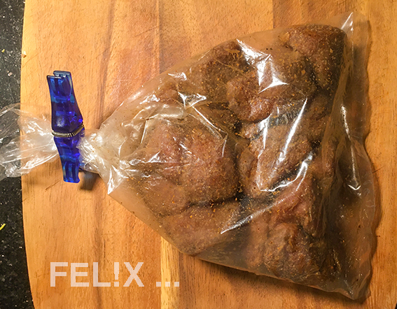 Zusammen mit der Gewürzmischung in einen Gefrierbeutel geben, verschliessen, gut schütteln, so dass die Fleischstücke ganz mit den Gewürzen überzogen sind.