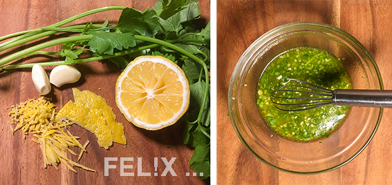Zitronensaft mit den weiteren Zutaten samt gehackter Schale, Sellerie und Knoblauch gut mischen.