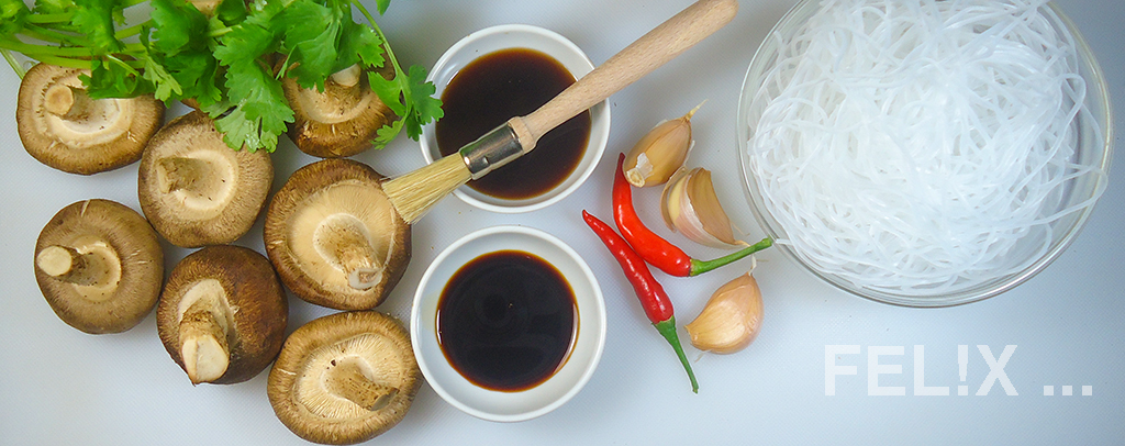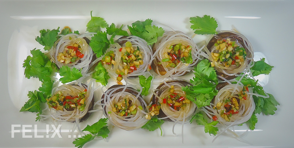 Hier darf endlich einmal etwas so richtig um den Finger gewickelt werden: nämlich Glasnudeln, die wie kleine Nestchen auf Pilzhüten sitzen!