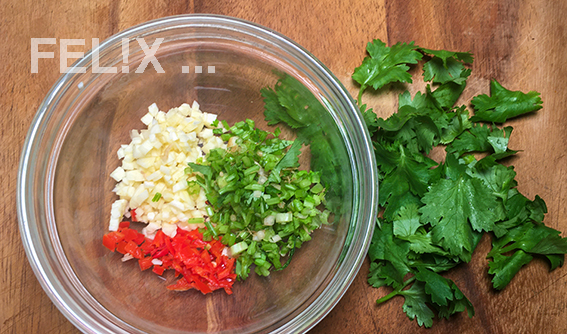 Vom Koriander die Blättchen beiseitelegen, Stängel (mit den Würzelchen, falls vorhanden!) hacken und samt Knoblauch und Chili in einem feuerfesten Schüsselchen beiseitestellen.