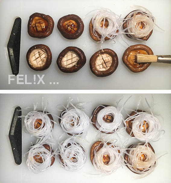 Glasnudeln gut abtropfen. Jeweils wenige davon um den Zeigefinger wickeln und auf die Pilze setzen.