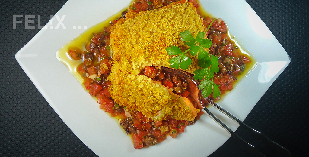 - durch den Couscous-Mantel, der entschieden dicker als eine Brösel-Panade ist, braucht es keine weitere Beilage