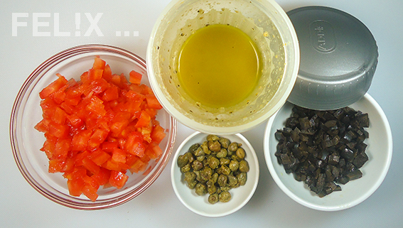 Erst kurz vor dem Servieren Sauce nochmals kräftig aufschütteln, mit Tomaten, Oliven und Kapern mischen.