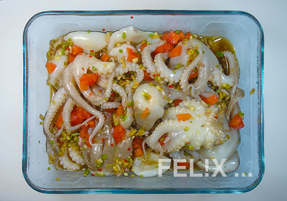 Marinade mit den vorbereiteten Pulpo-Teilen mischen, für 1–2 Stunden im Kühlschrank marinieren.