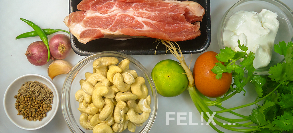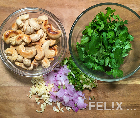 Cashewkerne grob mahlen, Korianderblättchen hacken.