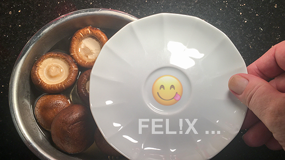 - zum Einweichen der Pilze einen kleinen Unterteller auf die Pilze in der Flüssigkeit legen, damit sie von dieser ganz bedeckt sind!