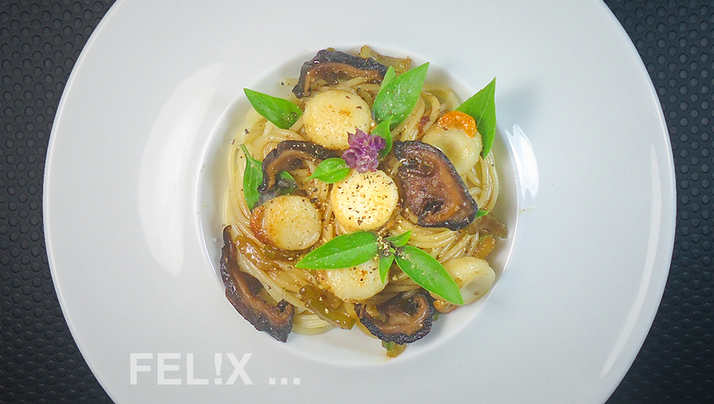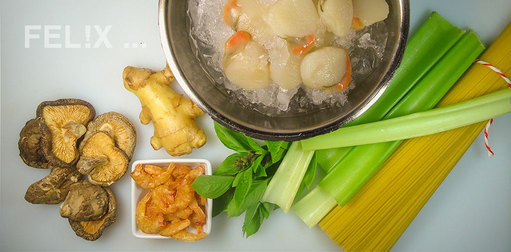 der hervorragend zu Jakobsmuscheln passt. Etwas Ingwer und Stangensellerie für einen Frische-Kick. Zusammen mit den kurz gebratenen Jakobsmuscheln kommt alles mit feinen Nudeln auf den Teller.