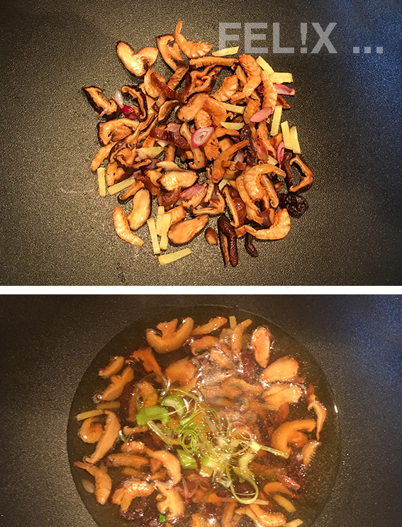 - anstelle von getrockneten Pilzen können auch 100 g frische Shiitake verwendet werden: nicht einweichen, in Scheiben schneiden, 500 ml Wasser für den Fond verwenden!