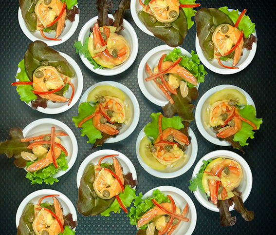 Je 4–6 Crevetten samt den weiteren Zutaten daraufsetzen, die Marinade darübergiessen und je eine Zitronenscheibe dazulegen.