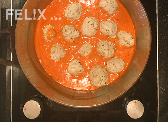 Die Brätchügeli zur Sauce geben, heiss werden lassen.