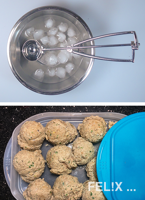 - wer keinen solchen Glacé-Portionierer hat, kann die Knödel auch mit zwei Esslöffeln formen. Diese ebenfalls in Eiswasser tauchen.