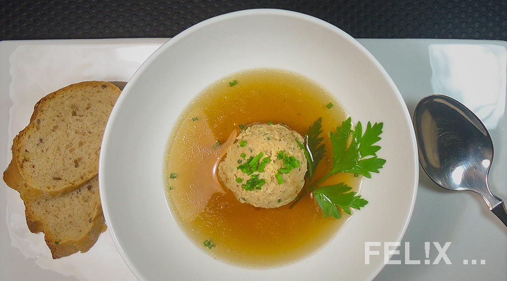 Als Vorspeise jeweils 1–2 Knödel in kleine Suppenschalen setzen und mit der Bouillon umgiessen.