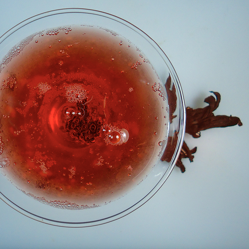 Ich habe aus diesen Rosella-Blüten einen Champagner-Cocktail zubereitet.