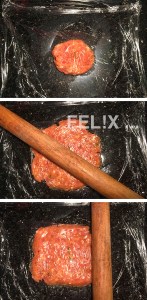 Je 40 g der Hackfleischmasse zwischen Klarsichtfolie flachdrücken und quadratisch formen.