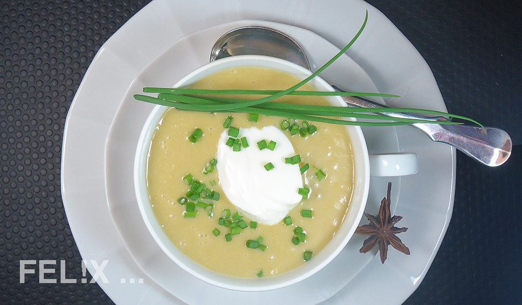 Lauch samt grünen Teilen kleinschneiden, Kartoffeln würfeln. Samt Sternanis in der Butter anziehen, bis das Gemüse etwas zusammenfällt. Dabei ab und zu rühren, Kartoffeln setzen gerne an!