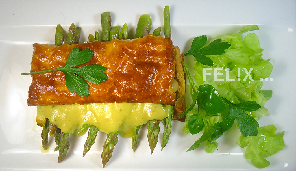 - die von mir gewählten 10×15 cm haben mit der Grösse der Teller, auf denen ich die Feuilletés serviere zu tun. Es geht natürlich jede Teiggrösse, ob rechteckig oder quadratisch. Falls grösser, als meine Teigstücke, muss natürlich auch die Länge der Spargelspitzen angepasst werden!