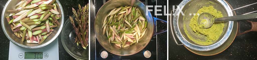 Fein pürieren, durch ein Sieb passieren (= ca. 350 g leichtes Spargelpüree).