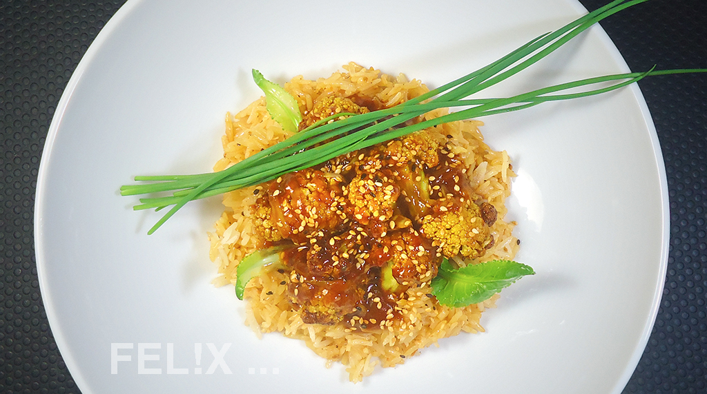• Blumenkohl in die Pfanne mit General Tso’s Sauce geben, mischen, heiss werden lassen