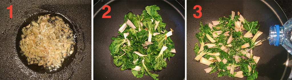 Baby Pak Choi: ganze Blättchen beigeben. Pfannenrühren, bis sie gar, aber noch knackig sind (2).