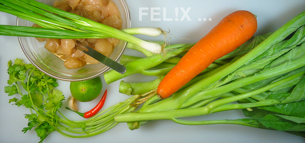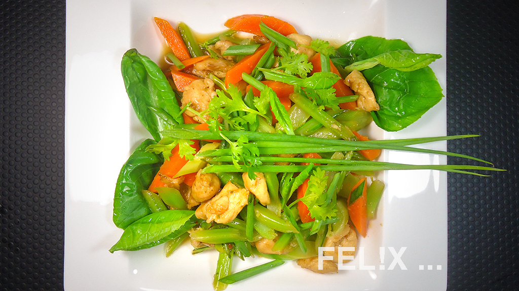 aus chinesischem Broccoli (e: Kale, Thai: Khanaa) mit gebratener Hähnchenbrust.