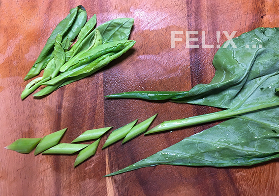Seitentriebe vom Stamm schneiden. Letzteren schälen (etwa wie Spargel). Blätter beidseitig von den Seitentrieben schneiden.