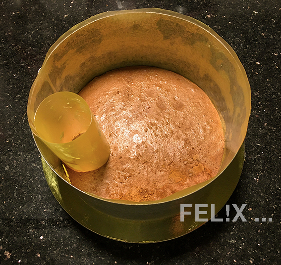 Biskuit-Masse im Ring verteilen, gut anpressen. Dies geschieht am besten mit dem Stopfer der Espresso-Maschine oder mit dem glatten Boden eines Glases.