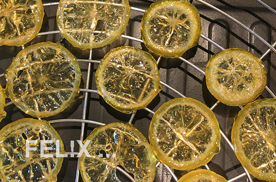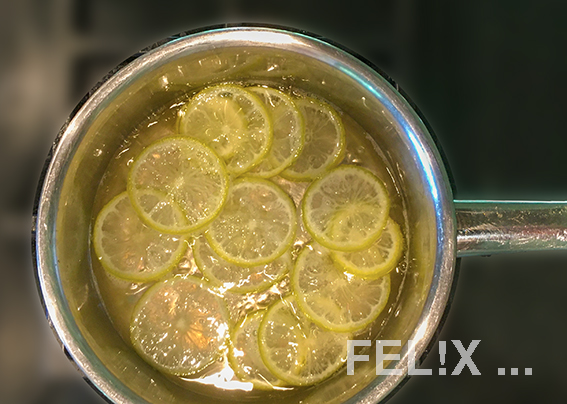 Zitrone zu 12–14 ca. 3 mm dünnen Scheiben schneiden (Aufschnittmaschine!), in reichlich kochendem Wasser ca. 10 Minuten blanchieren, um allfällige Bitterstoffe zu entfernen.