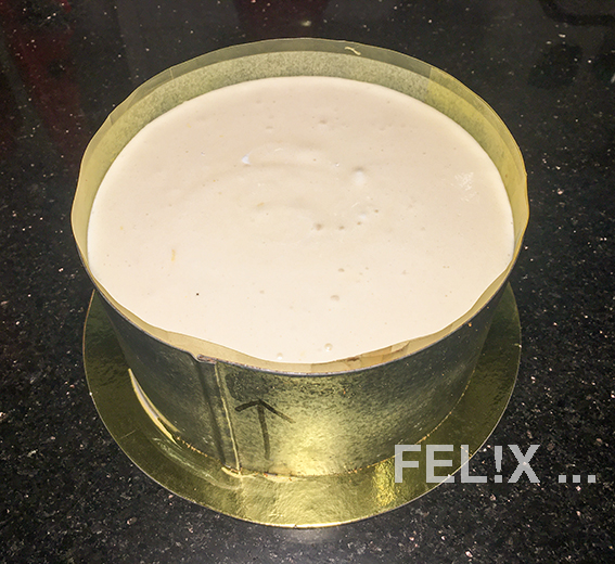 Ganache auf die Kuchenoberfläche giessen, durch Kippen der Form gleichmässig verteilen.
