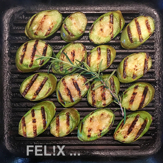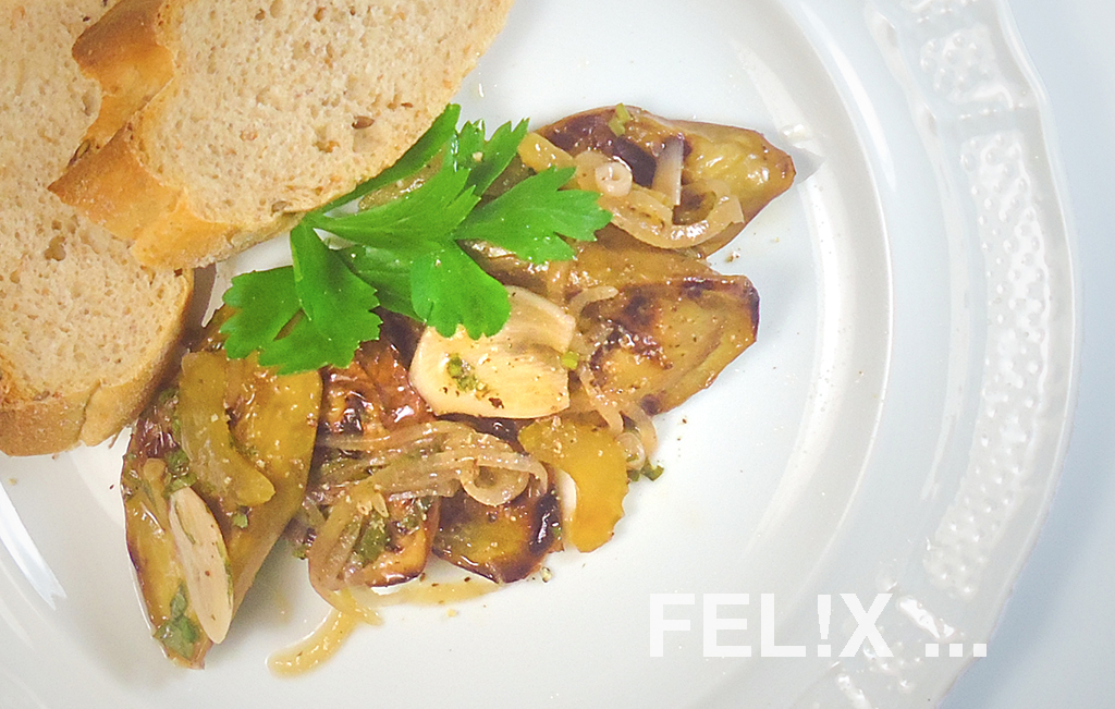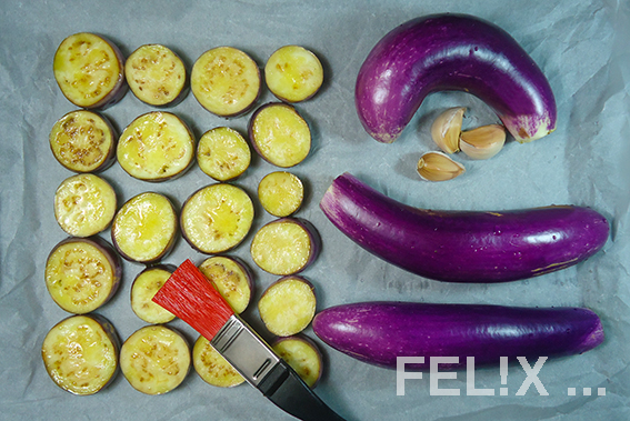 Für 300 g in Scheiben geschnittene Auberginen brauchte ich gerade mal EINEN TEELÖFFEL Olivenöl zum Braten.